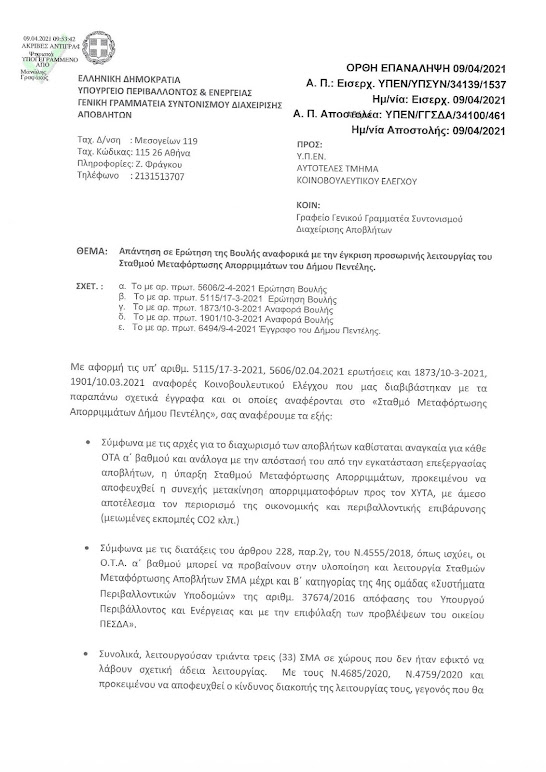 Μόνο σε αυτό το επίπεδο ο κ. Υπουργός εδέησε να απαντήσει μέσω του Γενικού Γραμματέα Συντονισμού Διαχείρισης Αποβλήτων κ. Γραφάκου, επισυνάπτοντας και απάντηση του Δήμου Πεντέλης .