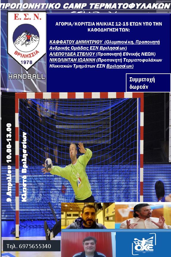 Ο ΕΣΝ Βριλησσίων σε συνεργασια με την ΕΑΠ/ΟΧΕ, βρίσκεται στην ευχάριστη θέση να πραγματοποιήσει το 1ο προπονητικό καμπ τερματοφυλάκων για αθλητές και αθλήτριες 12-15 ετων, την Κυριακή 9 Απριλιου 2017 στο κλειστό γυμναστήριο Βριλησσίων και ωρα 10.00 π.μ. – 13:00 μ.μ.
