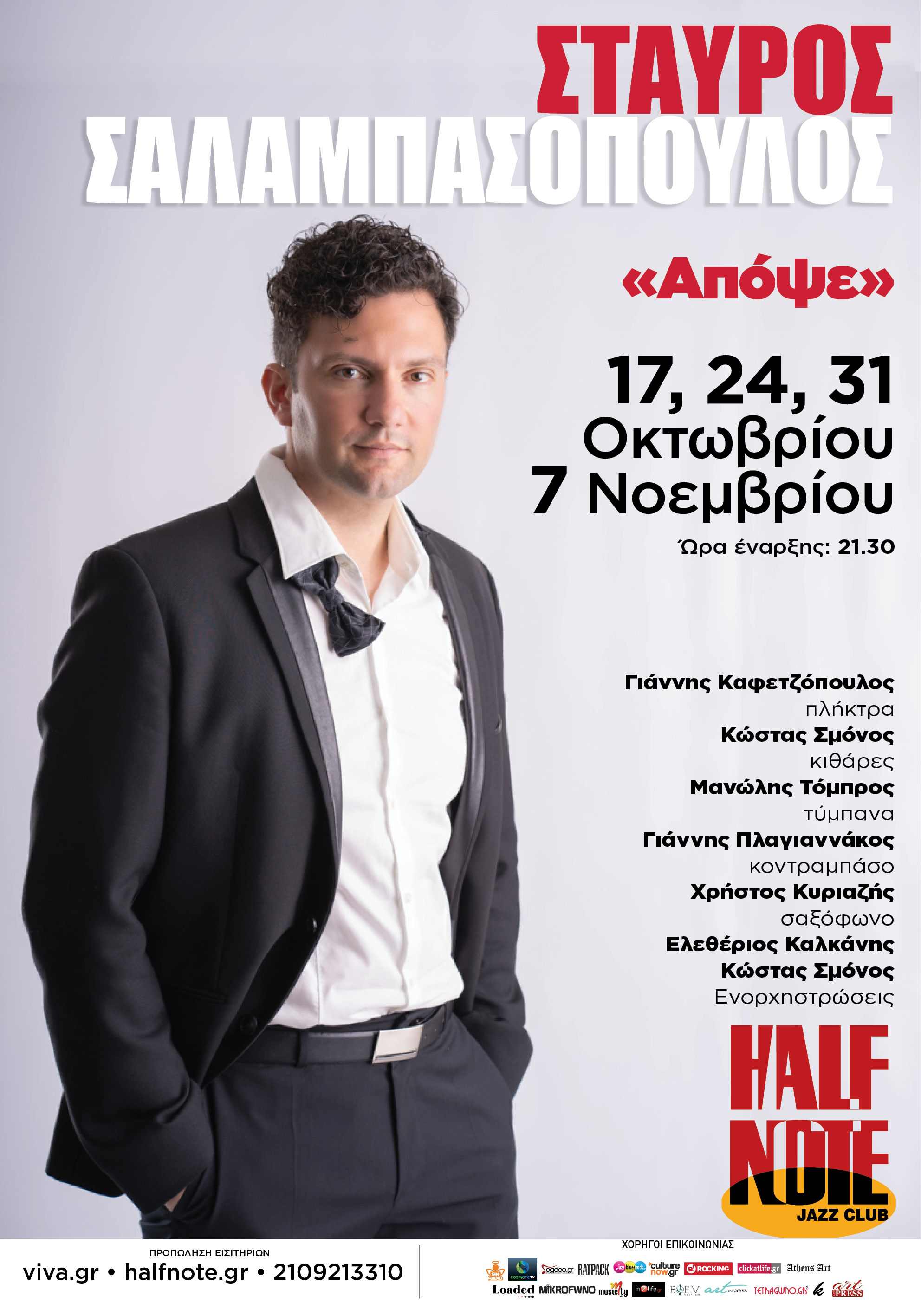 Ο πετυχημένος τενόρος Σταύρος Σαλαμπασόπουλος μετά από μια γεμάτη και ποικιλόμορφη δημιουργική χρονιά, με συμμετοχές σε ελληνικά και διεθνή φεστιβάλ, παραστάσεις με συνεχόμενες παρατάσεις που απέσπασαν εξαιρετικές κριτικές, ξεκινά την νέα καλλιτεχνική περίοδο με 4 εμφανίσεις στο Half Note Jazz Club.