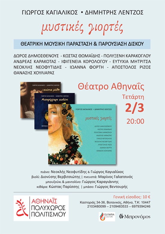Ο συνθέτης Γιώργος Καγιαλίκος και ο ποιητής Δημήτρης Λέντζος καταθέτουν την τρίτη δισκογραφική τους συνεργασία και παρουσιάζουν τα νέα τραγούδια του CD «Μυστικές γιορτές» στην μουσική σκηνή ΙΛΙΟΝ Plus.
