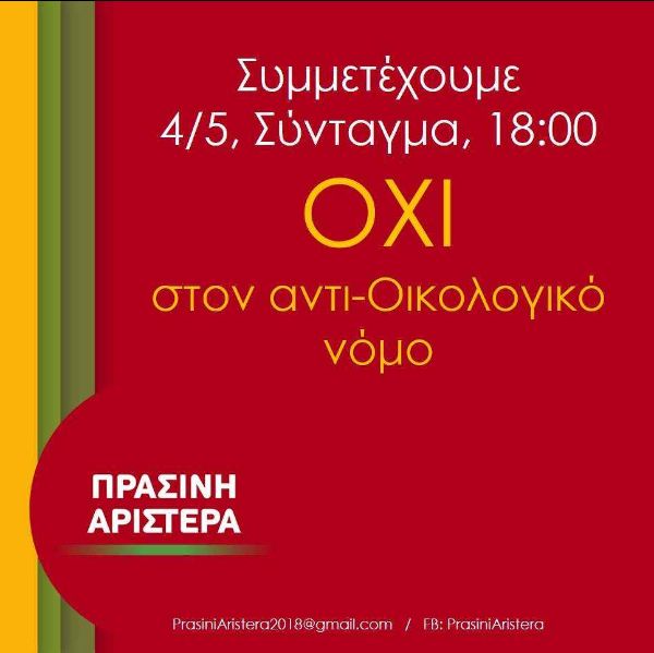 Η ΠΡΑΣΙΝΗ ΑΡΙΣΤΕΡΑ συμμετέχει και καλεί τα μέλη της στην συγκέντρωση ενάντια στον αντι-Οικολογικό νόμο.