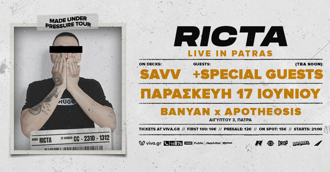 Ο Θεσσαλονικιός rapper RICTA παρουσιάζει το MADE UNDER PRESSURE TOUR, μετά από δεκάδες επιτυχημένες κυκλοφορίες και περισσότερα από 100.000.000 views σε όλες τις ηλεκτρονικές πλατφόρμες κατέχει πλέον μια θέση ανάμεσα στα πιο γνωστά πρόσωπα της ελληνικής drill και rap σκηνής.